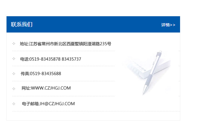 傳真:0519-83435688    郵編:213135    網址:WWW.czjhgj_com.jingyangdc.com    電子郵箱:JH@czjhgj_com.jingyangdc.com